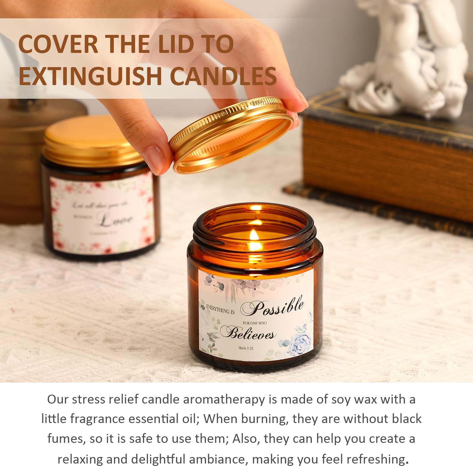 - 10 Bible Verses: with 10 different inspirational sayings, the religious scented candle aromatherapy can motivate the receivers to be positive, encourage people to get through the tough time and help to develop a positive mindset
