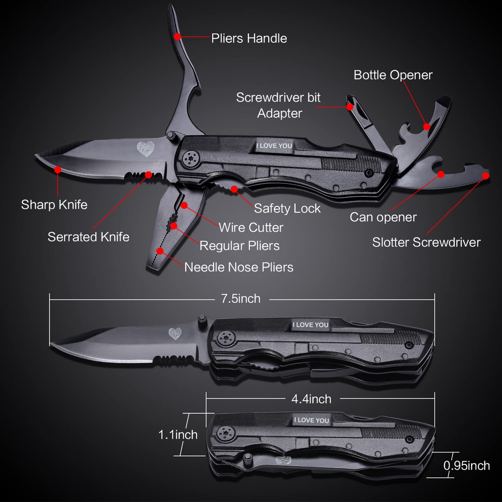 Multitool Pocket Knife for Men, Gifts for Boyfriend, Him, Husband, Dad, Multi Tool Tactical Plier With Nylon Sheath, Stocking Stuffer 'I LOVE YOU'