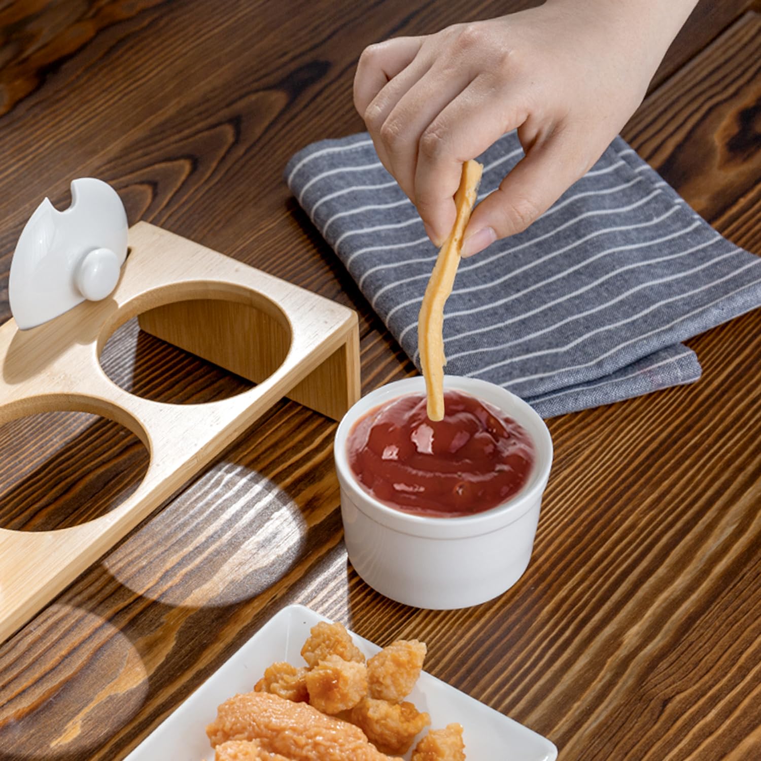 - Serving set includes three round ceramic dipping bowls with a 4-ounce capacity, each with a lid cover and serving spoon, perfect for sauces, dips, charcuterie, or small side dishes