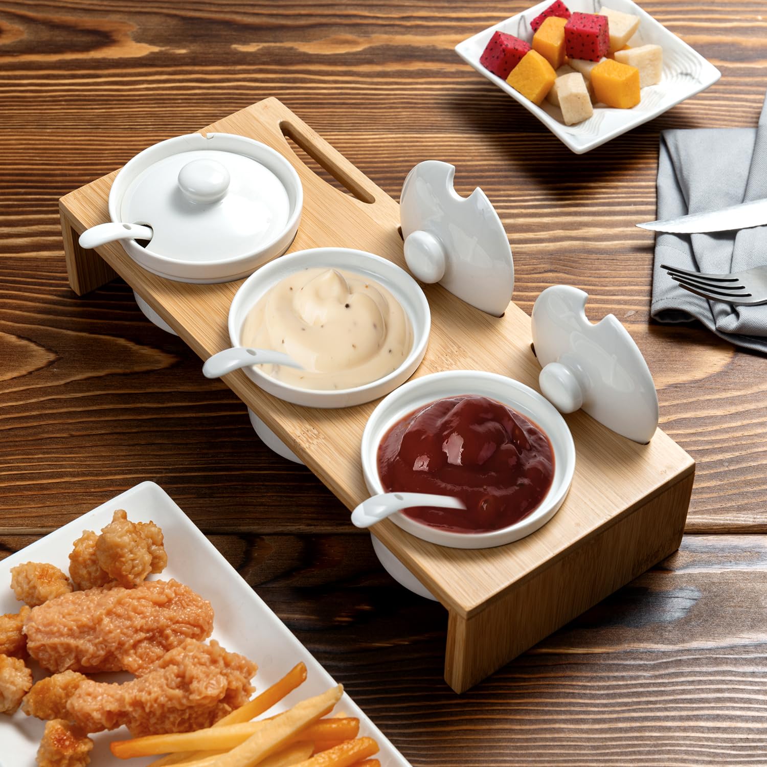 MyGift 10 Piece Condiment Pot Serving Set Includes Premium Solid Bamboo Wood Raised Display Server Tray and 3 Ceramic Ramekin Dip Bowls with Lids and Spoons