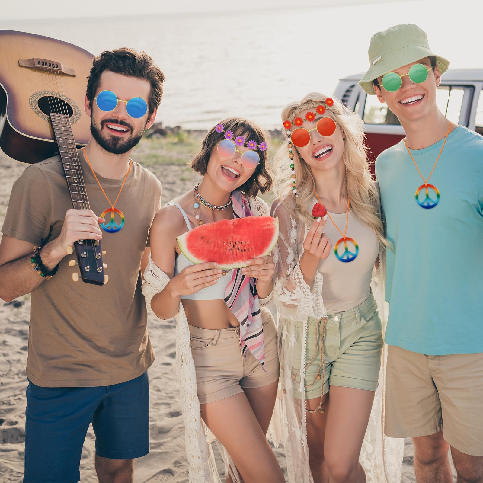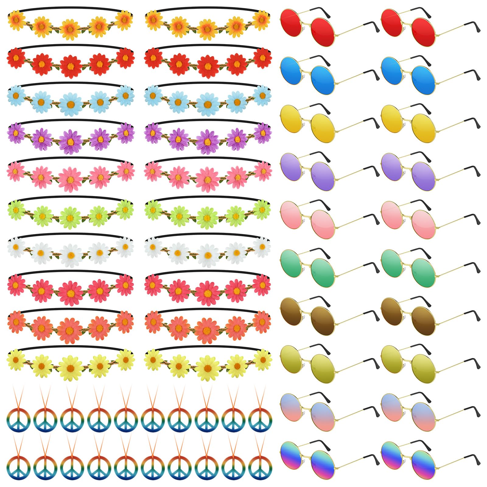 - Hippie costume accessory set includes: You will receive 20 pcs daisy headbands, 20 pairs of colorful sunglasses, and 20 pcs peace sign necklaces, the quantity is enough to meet your needs for dressing up
