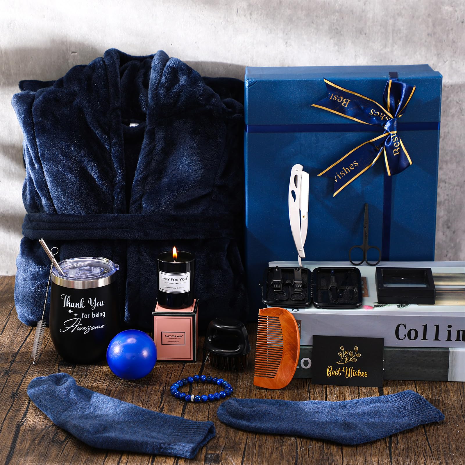 - Men's Gift Set: our 15 piece men's gift set includes a bathrobe, thermal cup, silk eye mask, socks, aromatherapy, men's bracelet, bracelet box, beard brush, toy ball, razor, comb, scissors, nail clipper set, greeting card and a navy gift box