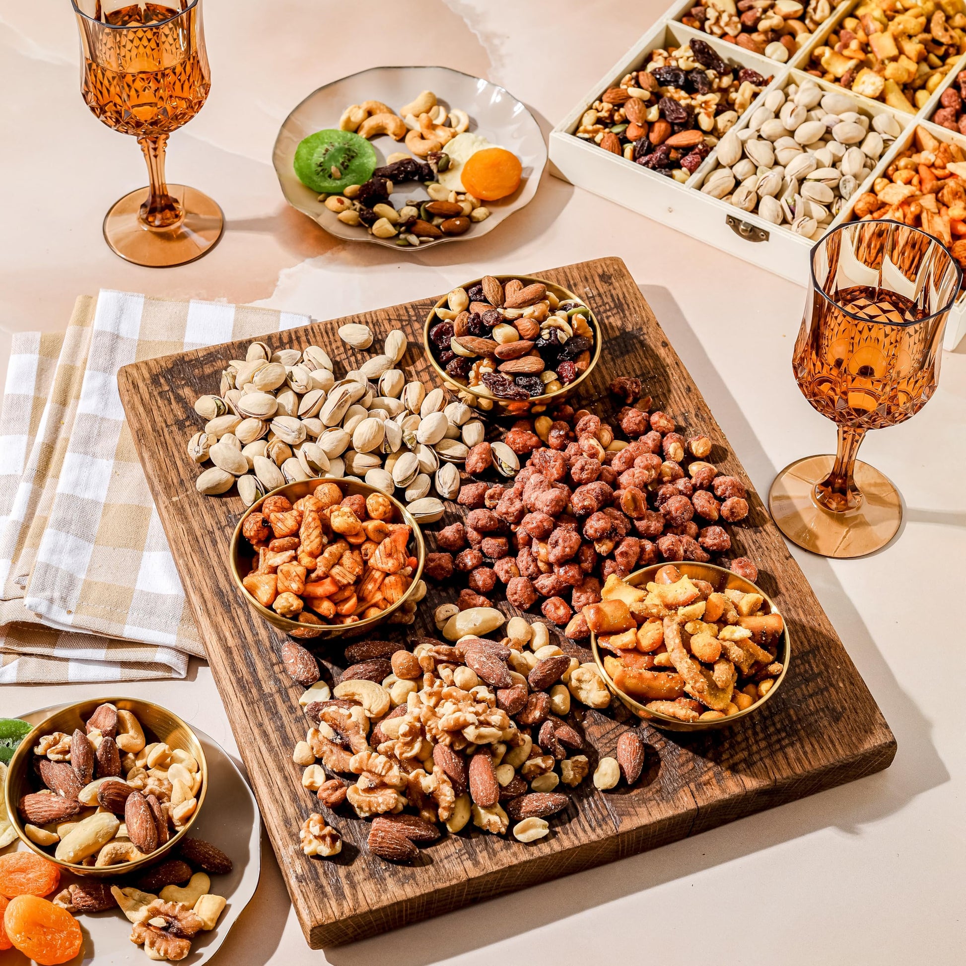 - GREAT ASSORTMENT Slip off the ribbon, open the latch, and be dazzled by a gourmet assortment of treats including Salted Pistachios, Salted Nut Mix, Honey Mustard Pretzel Mix, Spicy Pub Blend, Praline Peanuts and a Cranberry Health Mix.