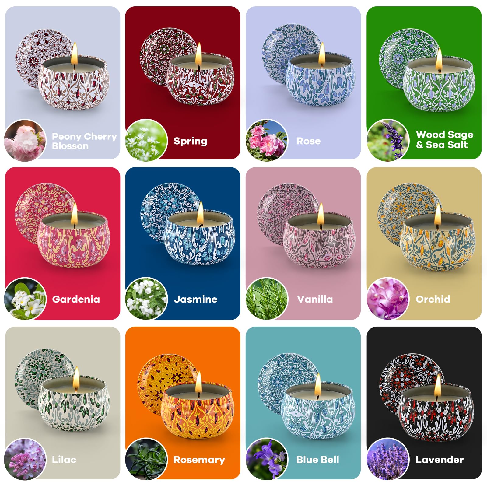 - Various Scented Candles Available: Contains 12 Scents: Rose Bluebell, Lavender, Orchid, Spring, Jasmine, Peony Cherry Blossom, Gardenia, Wood Sage& Sea Salt, Lilac, Rosemary, Vanilla, Whether you're looking for something bold and masculine or soft and comforting, there's a fragrance waiting to be discovered