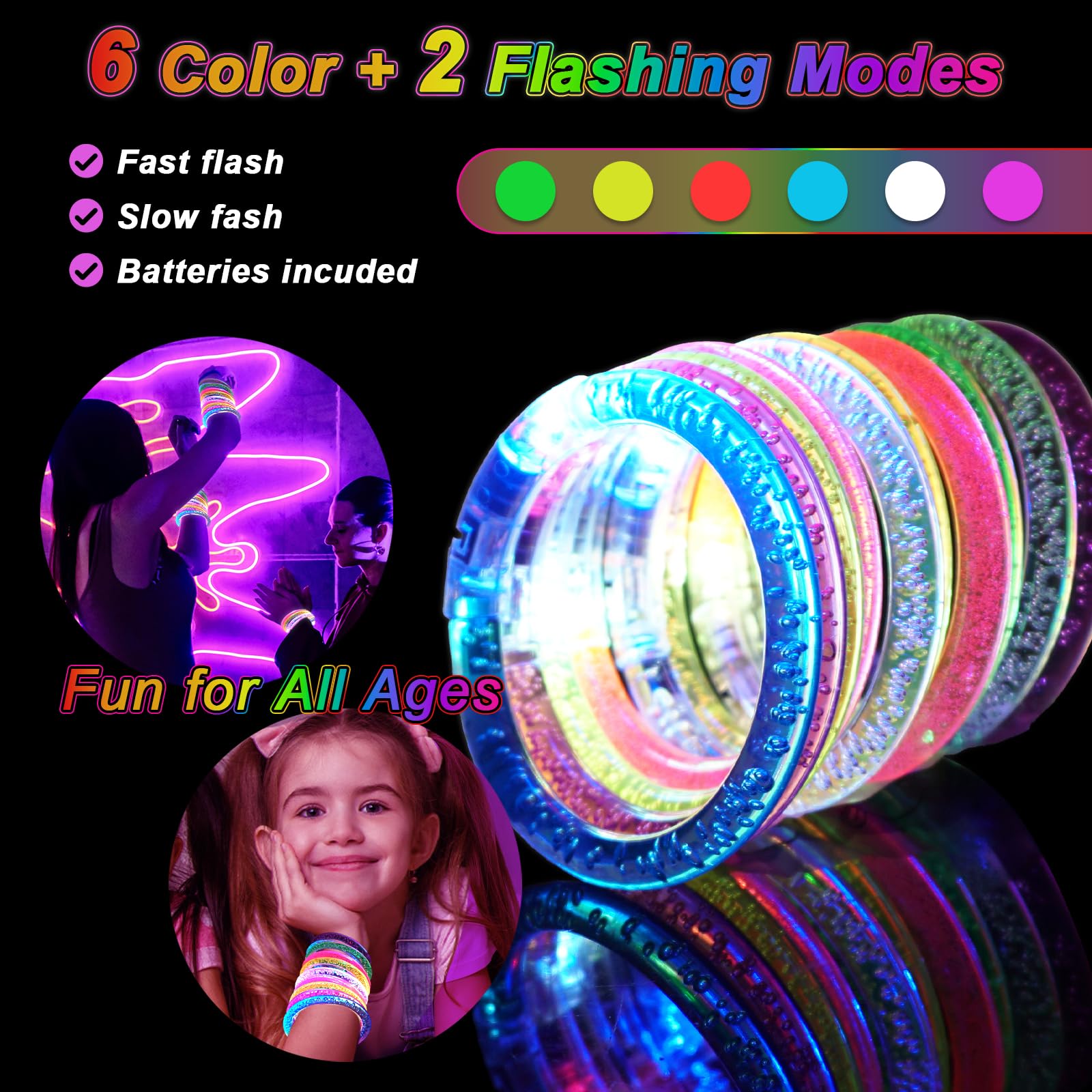 - Glow In The Dark Party Supplies:90PCS Glow in the Dark LED Bracelets in 6 Colors (Pink, Yellow, Crystal, Green, Sky Blue, Purple, Yellow), 3 flashing modes. The luminous bracelet has a large number of irregularly distributed bubbles that diffuse light through them, providing an extraordinary visual experience at night
