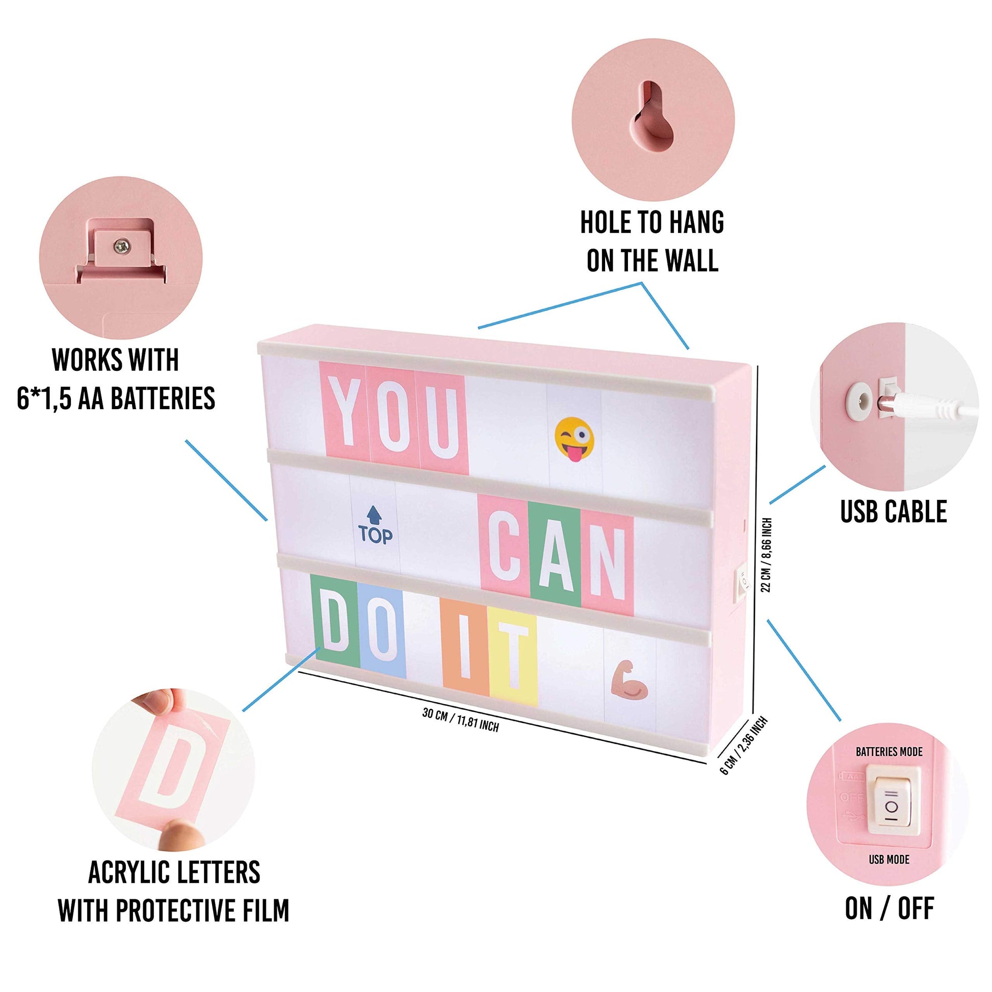 - π CREATE A SPECIAL ATMOSPHERE π Pink light up letter board with a dim led light perfect to give a feminine aesthetic touch to your room, office, business or any other place that you want to decorate. This light box with letters and emojis will become your perfect gadget to personalize your own message. Cinema box sign with letters as original gifts for moms, wives and girlfriends