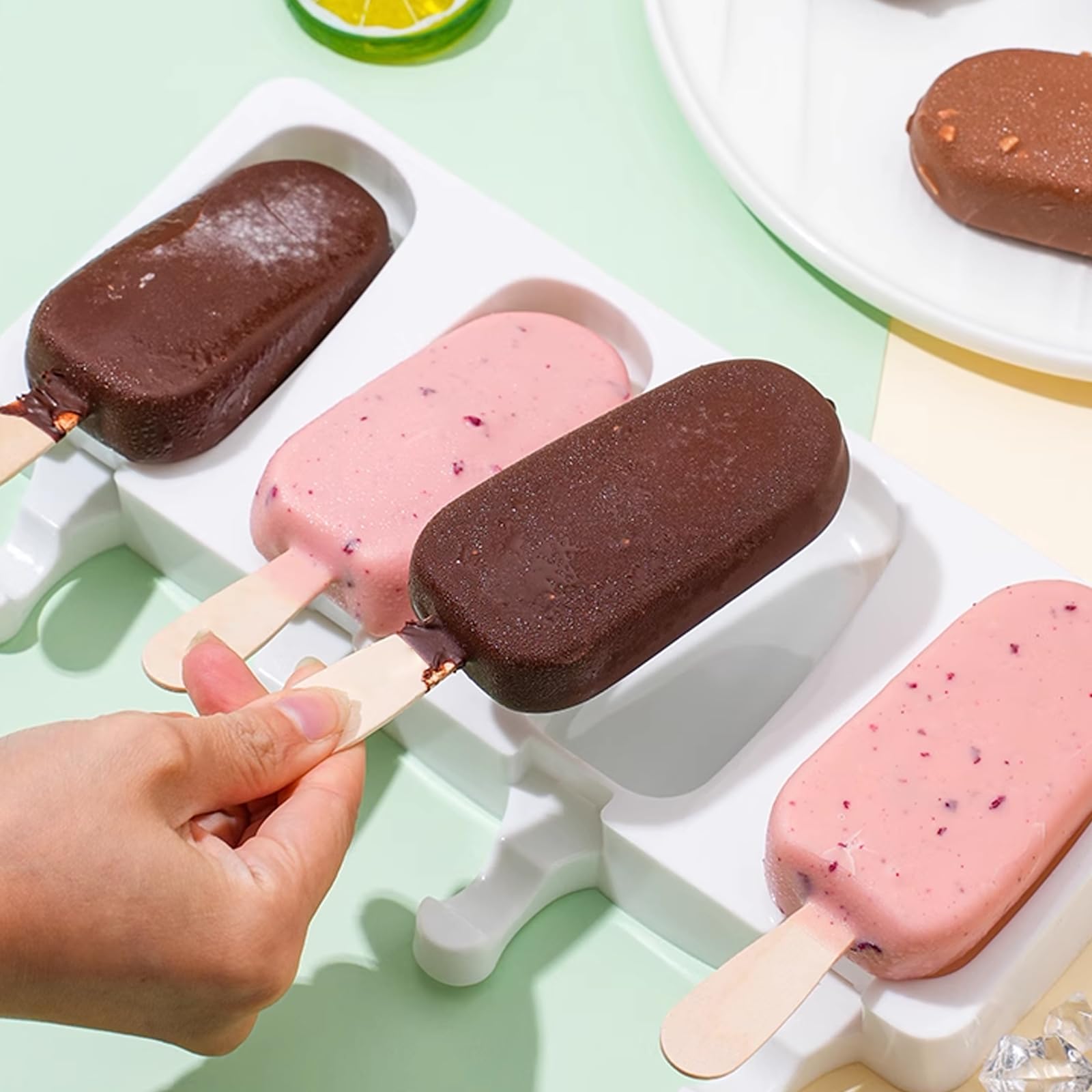 - Excellent Set: Package came with 3 white color ice pop mold, 50 pack wooden sticks and 50 pack parcel bags. After one batch of popsicles is frozen, another can be frozen immediately. The size of cakesicle molds silicone is 8.5 * 4.9 * 0.7in, each cavity is 2.7 * 1.5 * 0.4in.