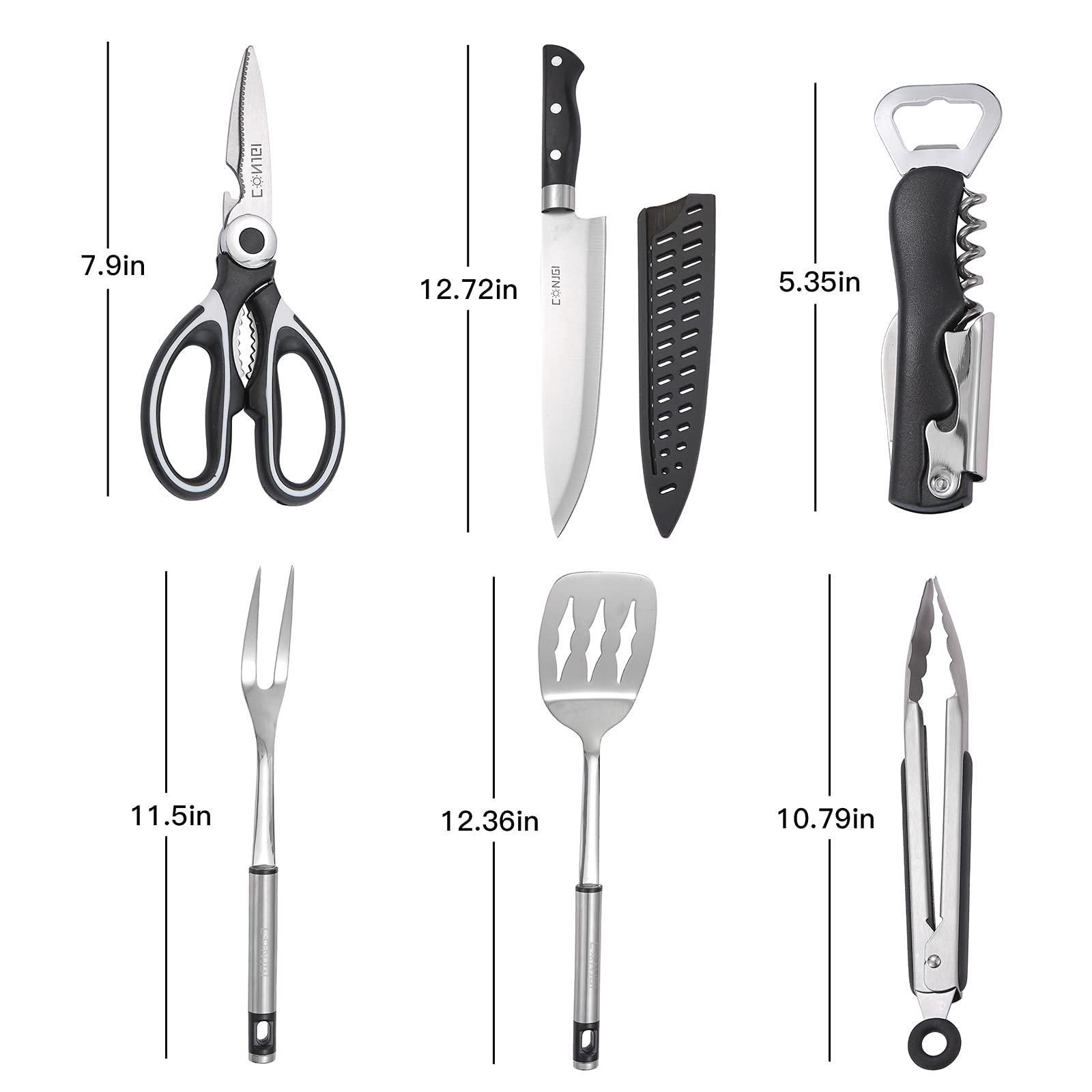 - Camping Cooking Accessories : Camping Cooking Utensils Set include Corkscrew, bread clip, scissors, chef's knife, frying spatula, barbecue clip, soup spoon, non-slip gloves, cutting board, paring knife, cleaning towel, 2* pepper shaker, 6 kebabs and storage bag,wild application beyond your imagine
