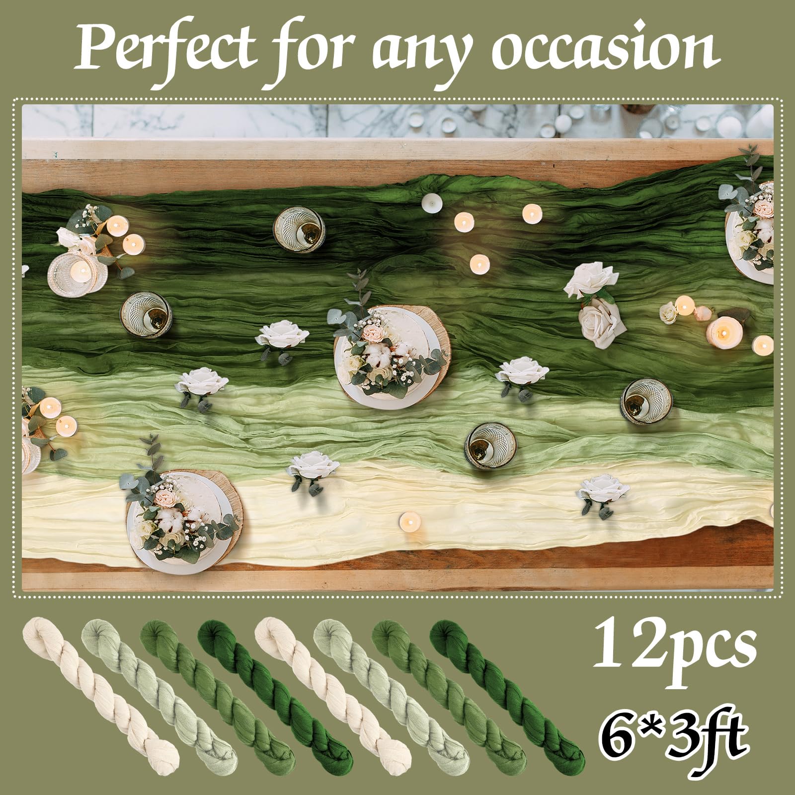 Remagr 12 Pcs Cheesecloth Gauze Table Runners Boho Wedding Decor Rustic Sheer Runner for Wedding Table Bridal Shower Birthday Party Decorations(Gradient Green,12 Pcs)