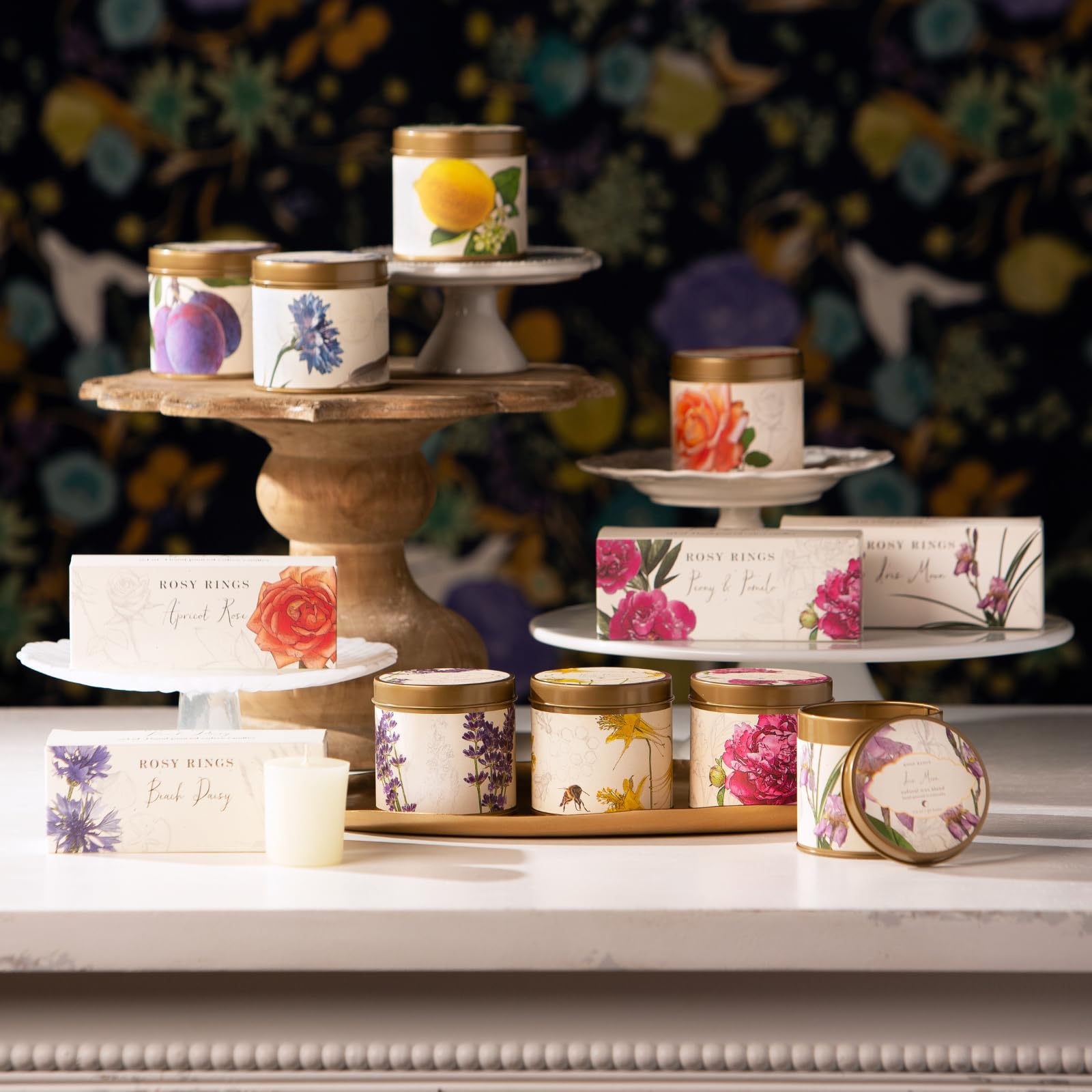 Rosy Rings Signature Tin Candle - Aromatherapy Fragrance Elegant Home Decor Gift Long Lasting 50 Hour Burn Botanical Floral Notes of Apricot, Blond Woods, Mirabelle Plum, Pomelo, Violet (Apricot Rose)