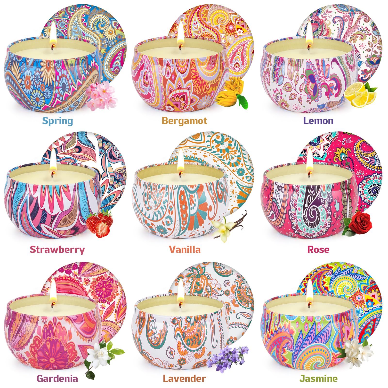 - 【9 Types Scented Candles】 - The handmade small candle gifts set includes 9 fragrances: Rose, Jasmine, Vanilla, Spring, Bergamot, Lemon, Strawberry, Gardenia, Lavender. Rich fragrances uplifting mood, stress relief, loosen body and mind, alleviating mood swings and making you feel cheerful.