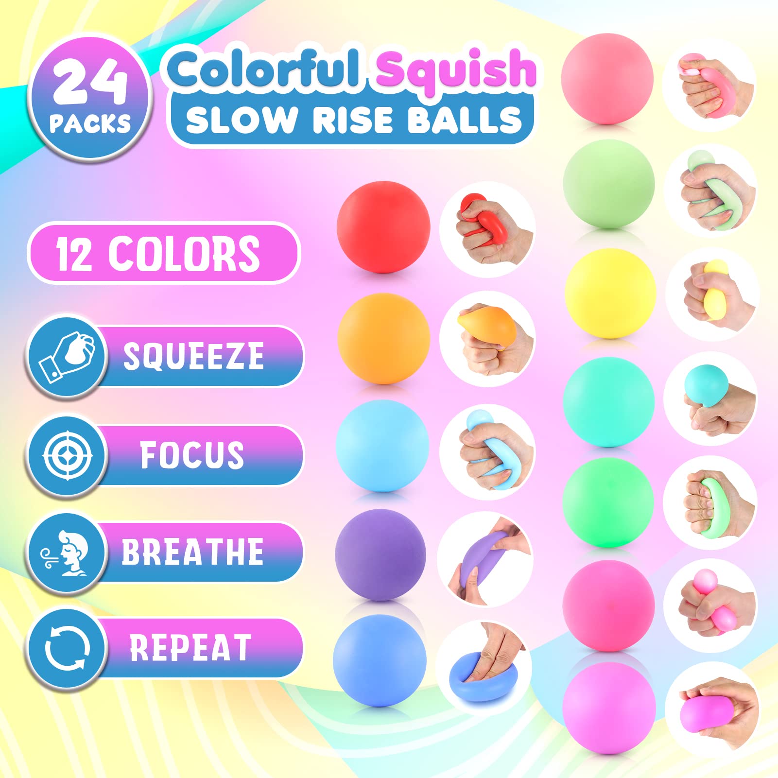 - 【GREAT VALUE LARGE QUANTITY SET】More quantity, more affordability, more softness, more surprises! A large box of soft assorted colors of 24 slow bounce balls. Perfect squishy fidget toys can be used in various situations in daily life such as room, school, office, and the car also can be used as a wonderful party favor, Christmas stocking stuffers, Easter basket fillers and birthday gifts