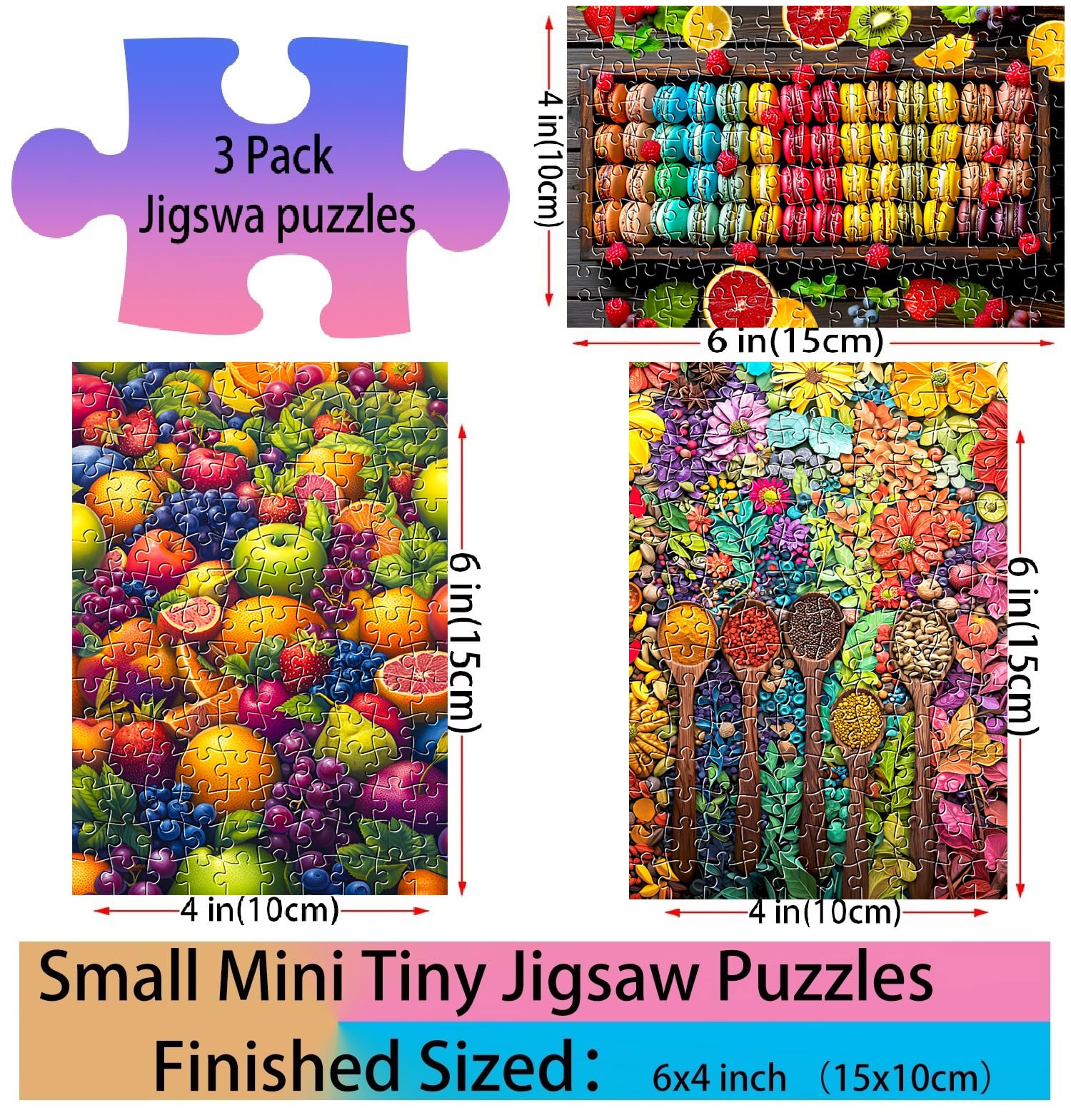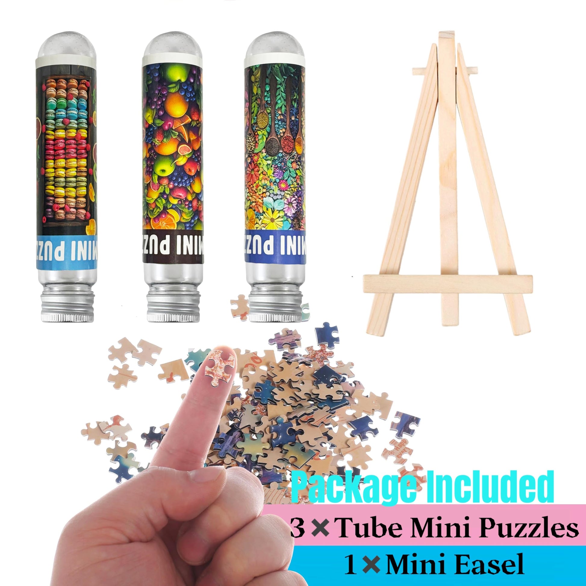 Small Jigsaw Puzzles for Adults 150 Pieces Mini Jigsaw Puzzles Challenging Colorful Macarons & Fruit Puzzles 6 x 4 Inches, 3 Pcs,Mini Easel Included