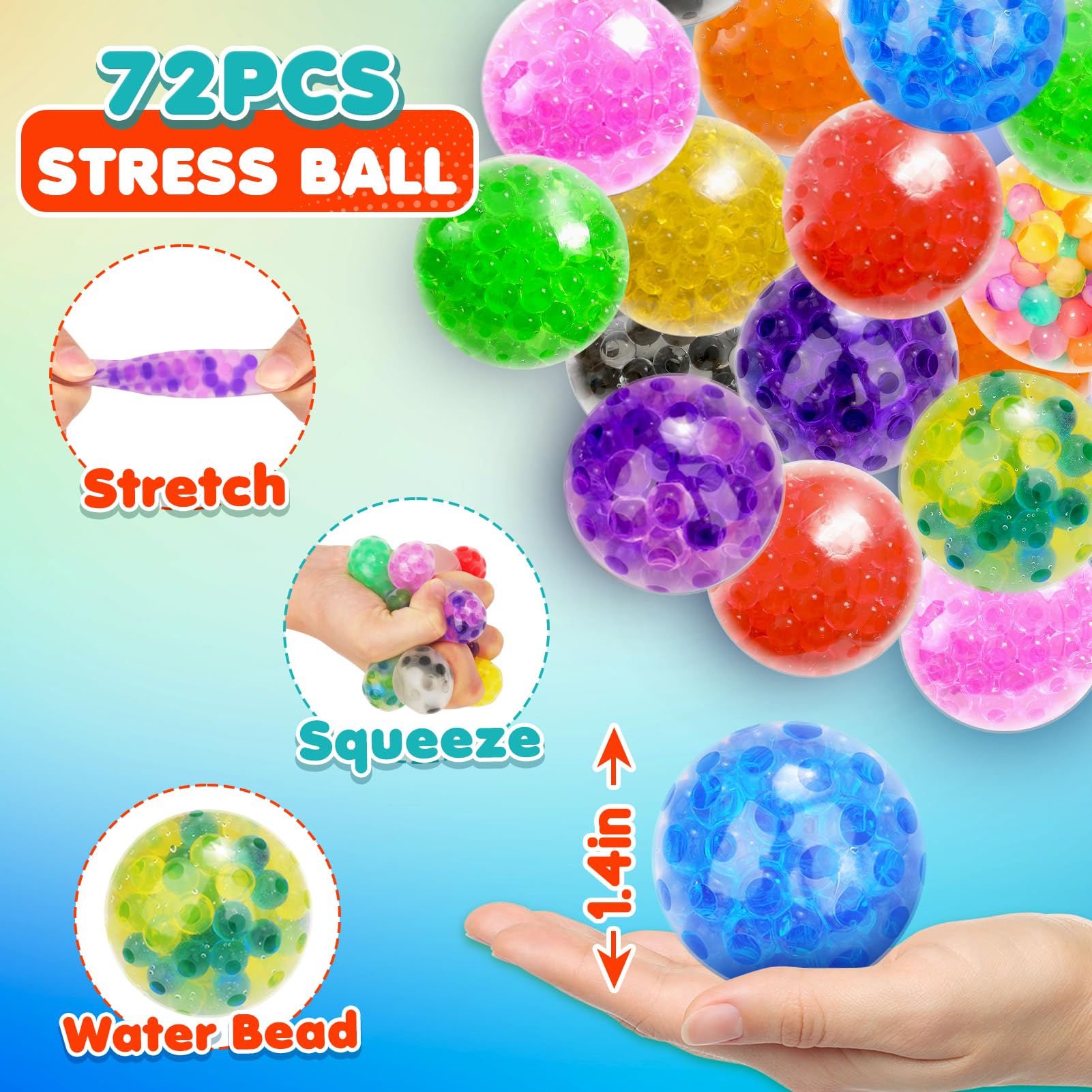 - 【72-PACK STRESS BALLS SET】Immerse yourself in the vibrant world of stress with our set of 72 sensory stress balls. Crafted in 12 eye-catching colors, these cute and soft mini sticky balls, measuring 1.4 inches, are designed for anyone seeking relaxation and concentration. The perfect stress toy for individuals of all ages, these stress balls are here to accompany you on your journey to tranquility.