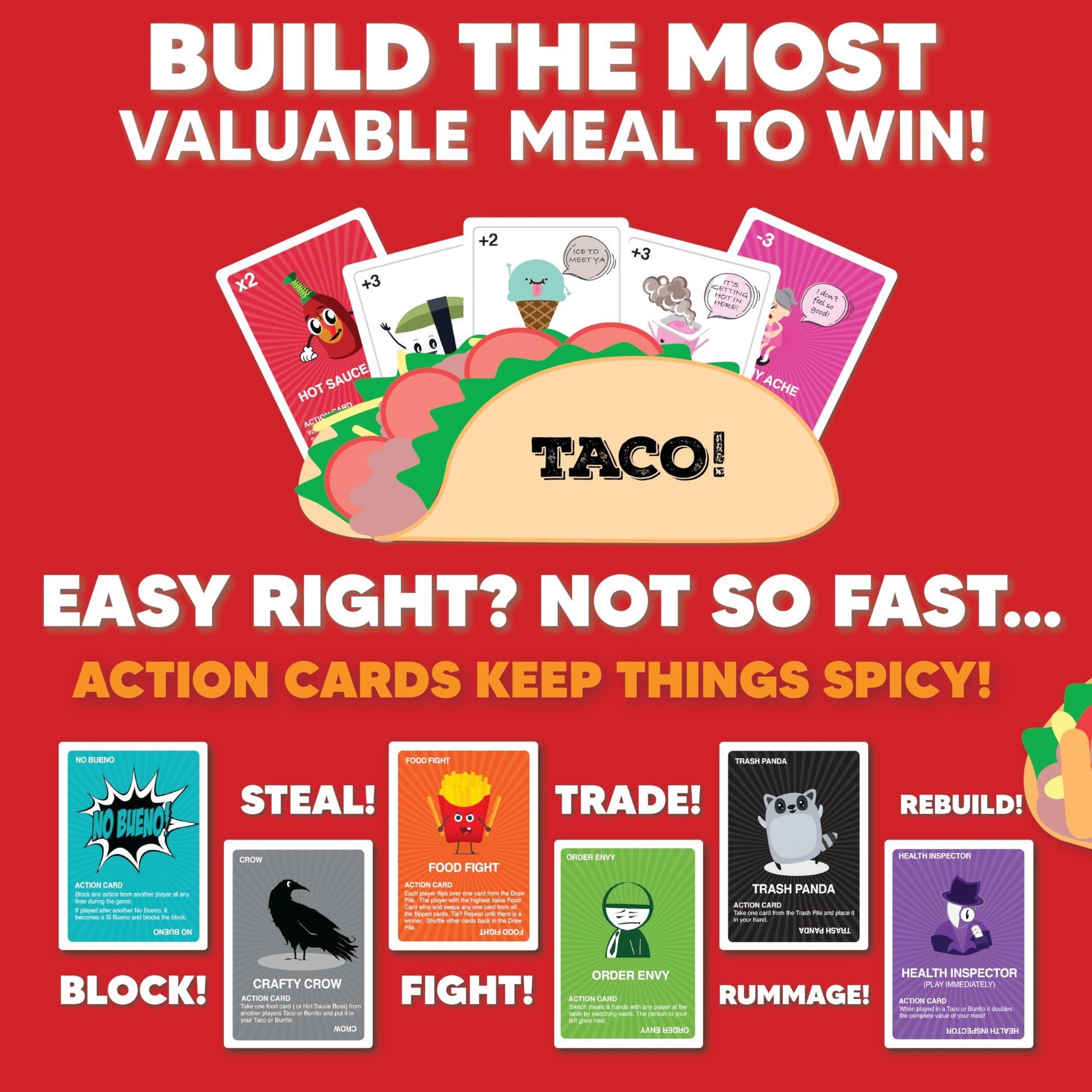 - Complete Set for Epic Fun: Taco vs Burrito core game has 56 cards (ingredients and actions), 4 taco/burrito meal holders, 3 quick start cards, and a rule book. For 2-4 players, ages 6 to 106+.