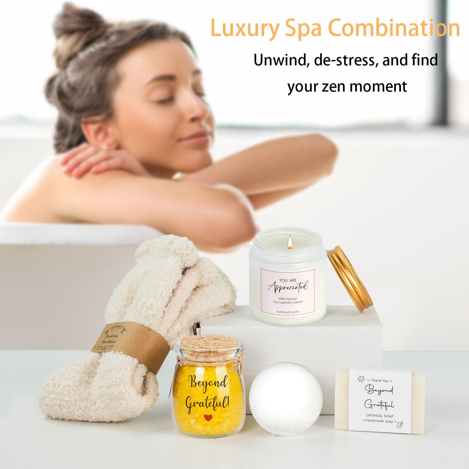 - A Journey of Relaxation and Gratitude: Each component in this employee appreciation gift box is chosen for its ability to provide comfort, relaxation, and a tangible reminder of your appreciation. Imagine the recipient unwinding after a long day at work, lighting one of our calming candles and letting its gentle aroma fill their home. Picture them slipping into a warm bath sprinkled with our premium bath salts, feeling every ounce of tension melt away. Ultra-soft and comfortable, these socks are perfect for cozy nights in, providing warmth and comfort that last long into the night.