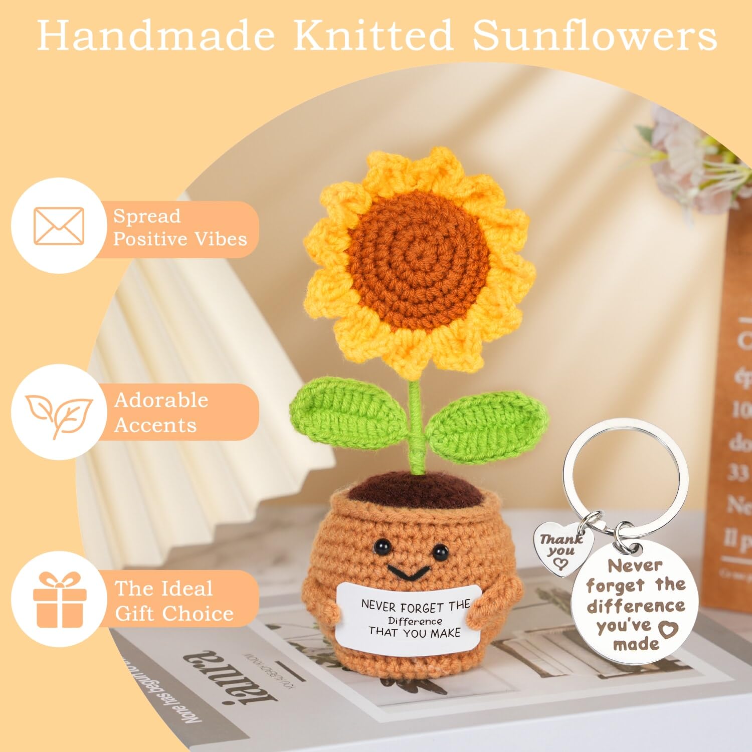 - All-in-One Thank You Gift Box: This meticulously crafted thank you gift box is a symphony of thoughtfulness and care, designed to offer a complete sensory experience that appreciates the special people in your life. This thank you gift basket includes an appreciated candle, bath salt ball, furry sleep socks, thank you cup, appreciation keychain, handmade bar soap, handmade crochet sunflower, and a thank you card.