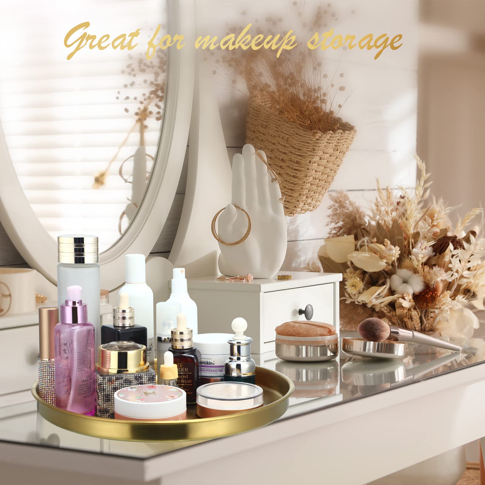 - Proper Size: circle gold perfume tray measures approx. 12.2 inches/ 31 cm in diameter and 1.06 inches/ 2.7 cm in height, you can use the circle gold tray as a jewelry holder, cosmetic organizer, coffee table tray, key holder, candle tray, whiskey display tray, glasses tray; You can also turn gold round tray upside down and use it as a stand