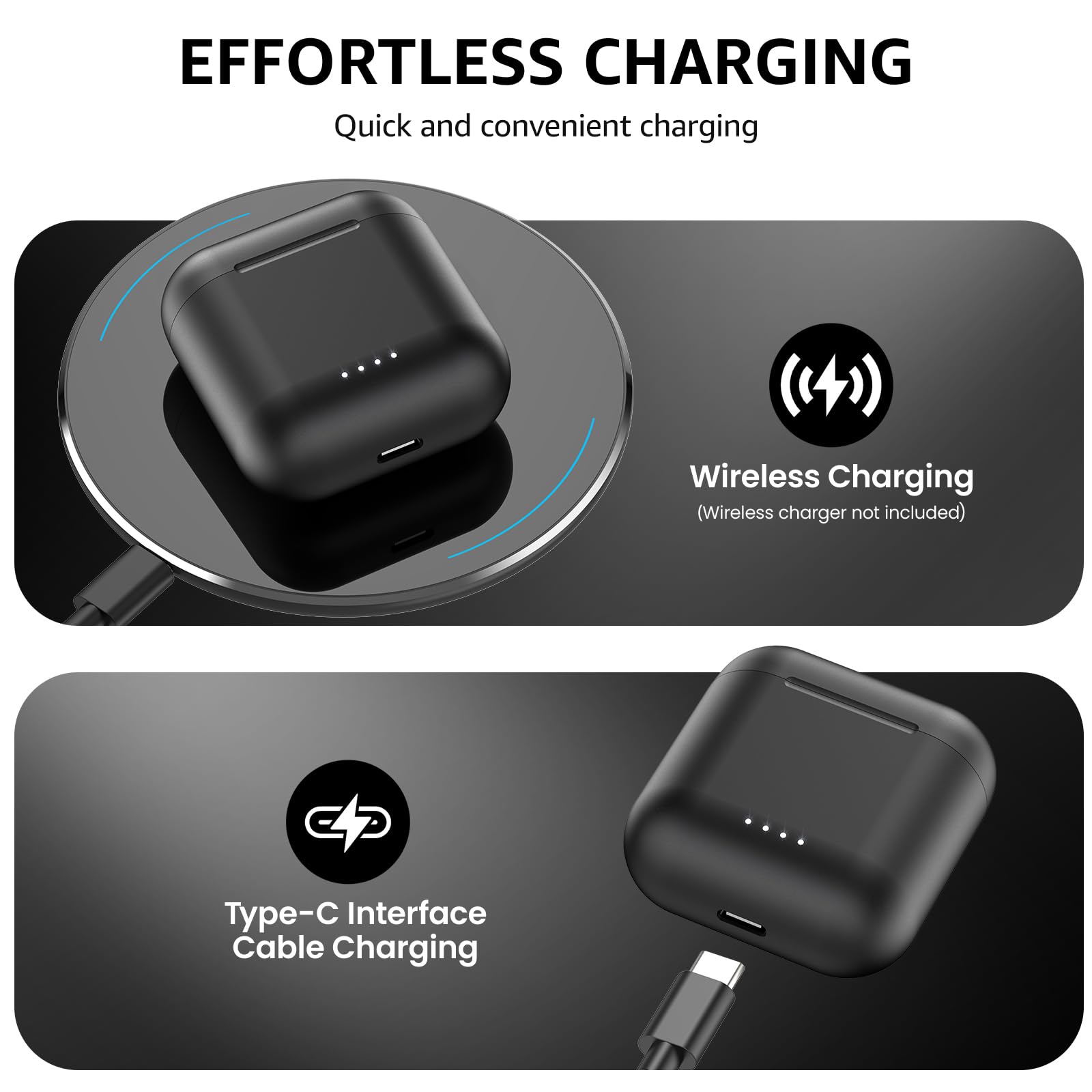 - [50Hrs Playtime Endurance] Get up to 10 hours of playtime on a single charge, and extend it to 50 hours with the charging case. Enjoy fast charging,the case fully charged in just about 55 minutes via USB-A to Micro USB cable, or under 2 hours wirelessly, offering a hassle-free charging experience.