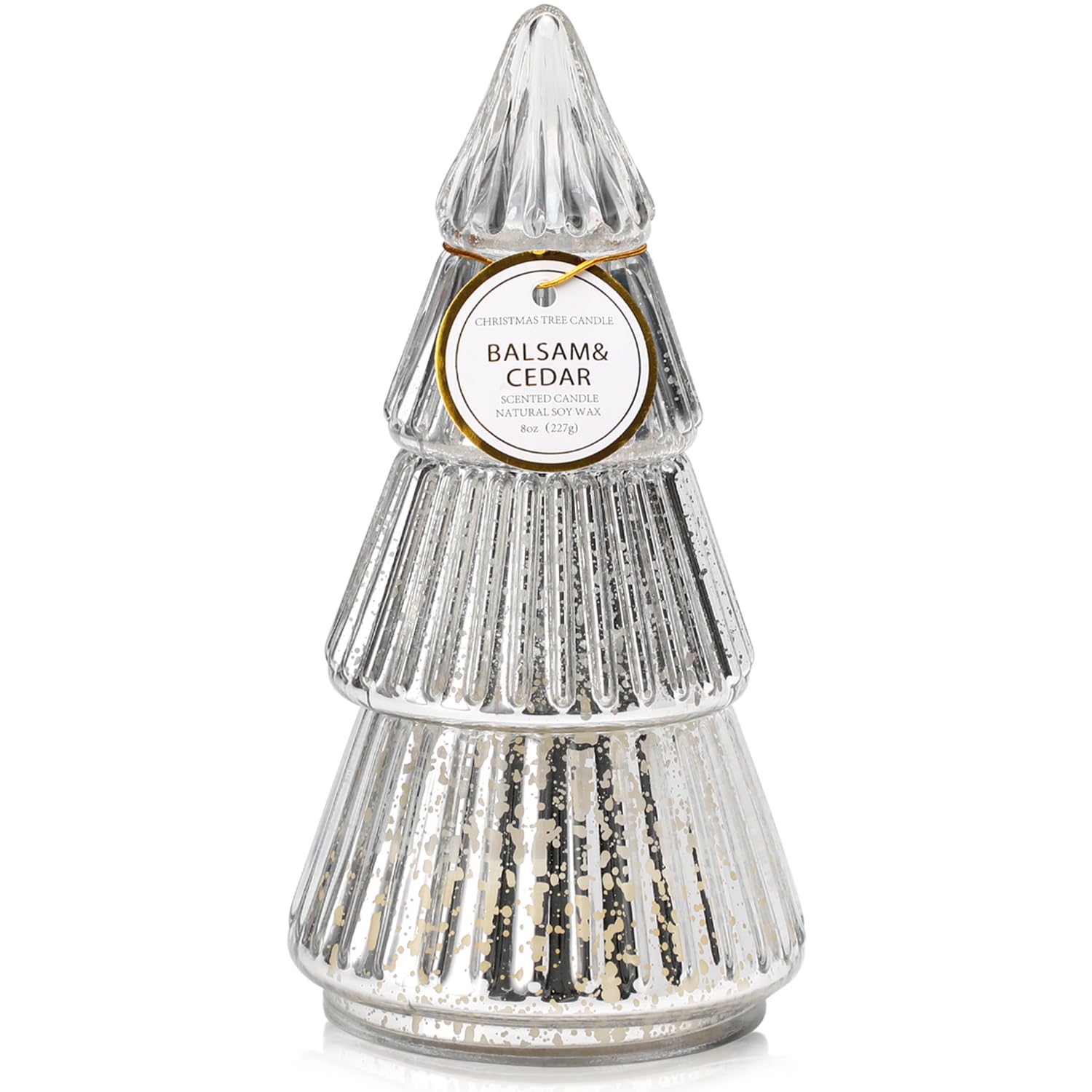 Tree Shaped Scented Candle Gift, Balsam Cedar Scented Candle, Holiday Winter White Silver Mercury Glass Tree Candle, 8oz