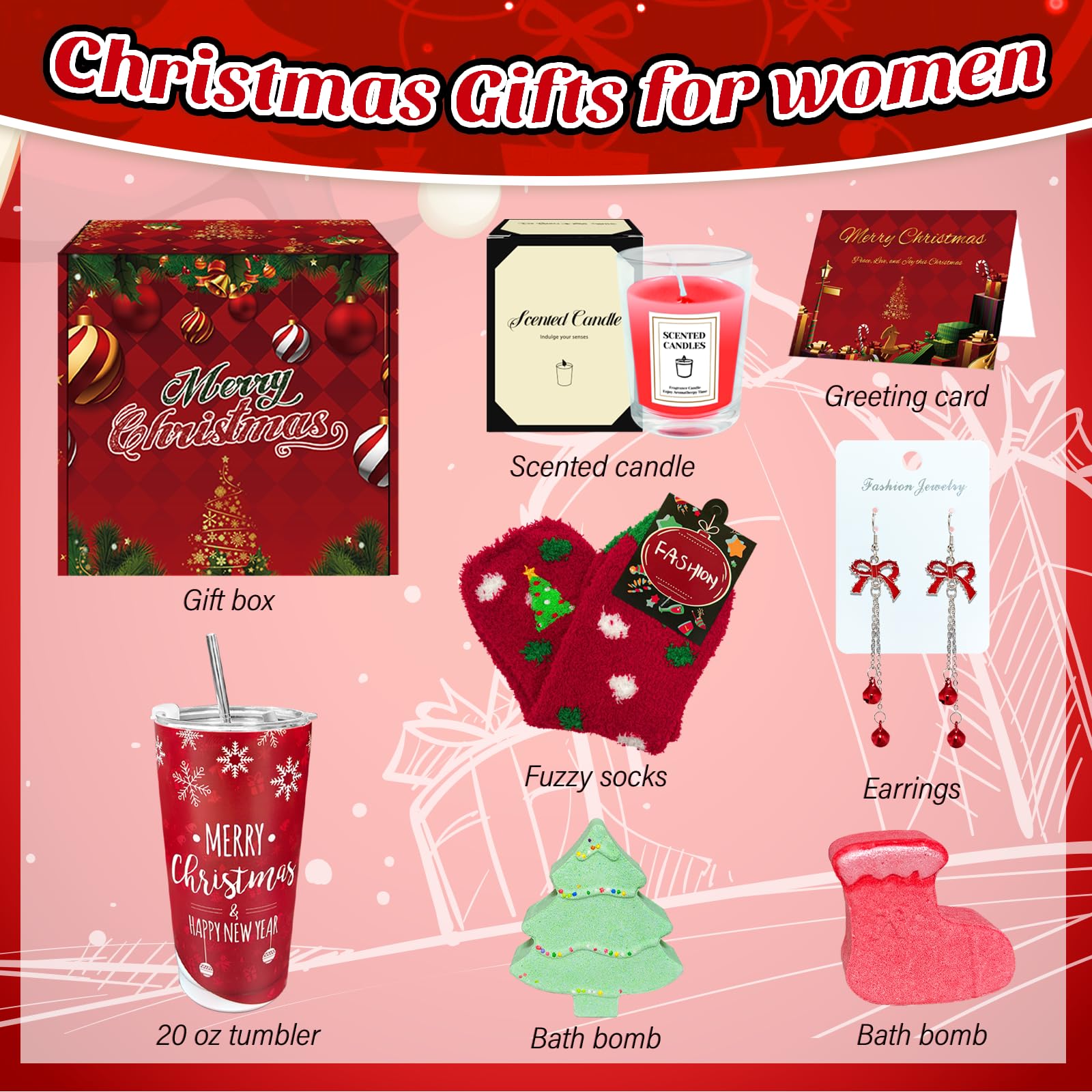 - Embark on a Warm Encounter Together: When the melody of Christmas rings, the Christmas gifts for women quietly descends. This Christmas gift baskets contains a tumbler with straw, two relaxing bath bomb, a scented candle with white tea smell is nice, a pair of fuzzy socks, a pair of precise bow earrings, and a thoughtful greeting card, open it and start a warm Christmas journey