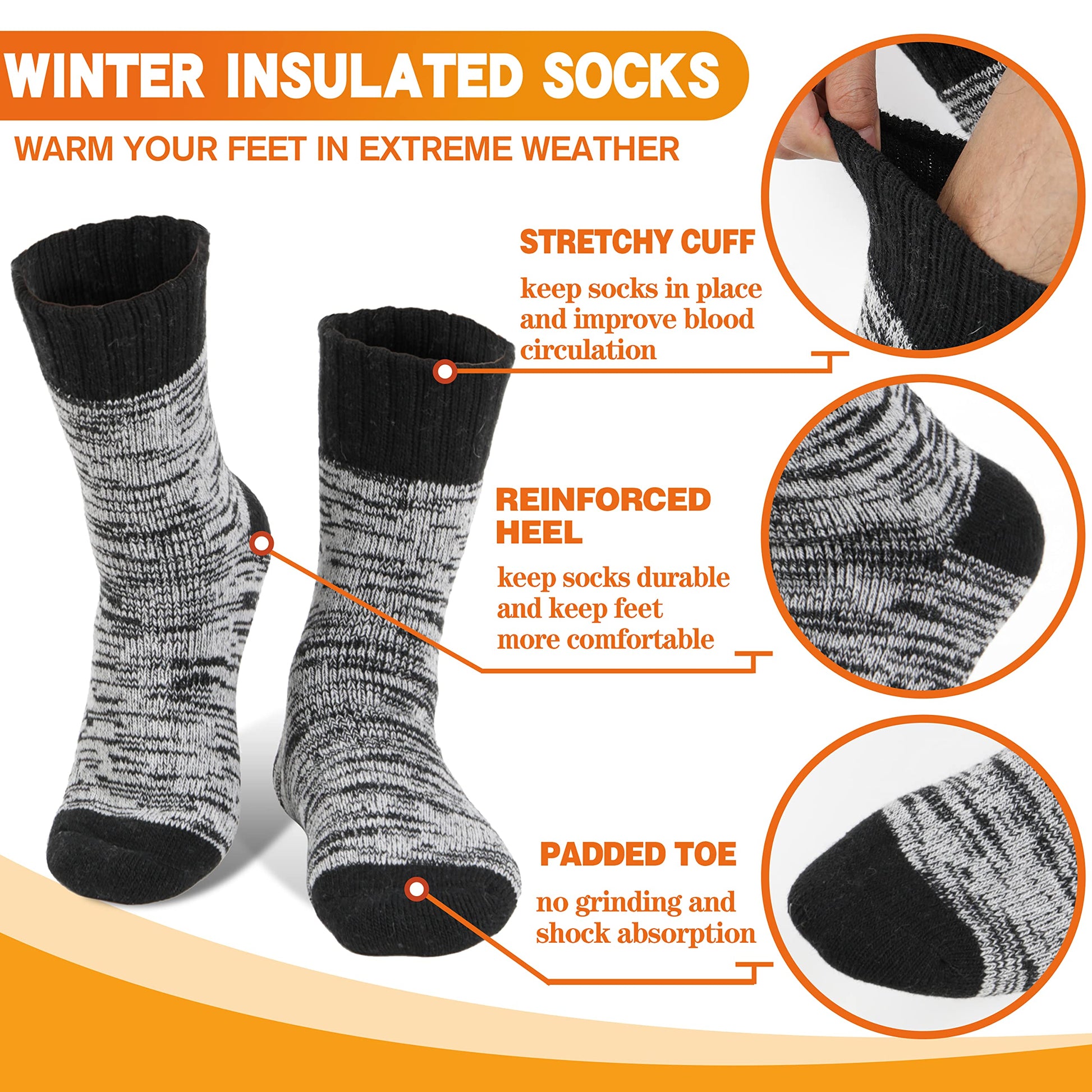 - 【Keep Feet 7X Warmer】Designing with thick thermal brushed fleece inner, these heated warm socks can keep your feet warm for long time in winter or in the coldest environments. They are 7X warmer than cotton socks and have superior insulation for the extreme cold weather. Excellent ski boot socks for men and women!