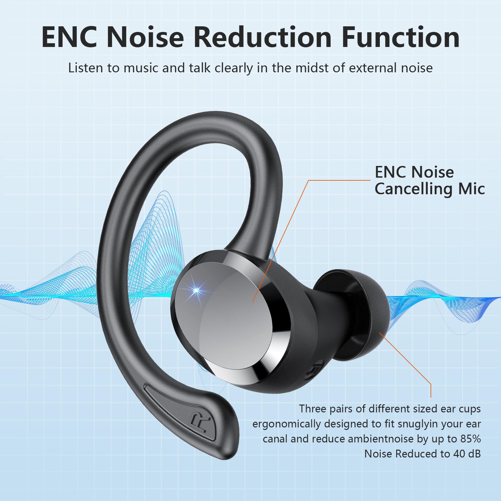 - 【IMMERSIVE 3D STEREO SOUND WITH CLEAR CALLS】The wireless sports headphones come with 14.2mm dual-layer graphene drivers that deliver deep bass and CD-quality sound for vivid, detailed sound reproduction. The wireless earbuds' built-in ENC microphone effectively reduces background noise by 75%, ensuring clear, distortion-free calls even in noisy environments, so you can communicate with others face-to-face with clarity.