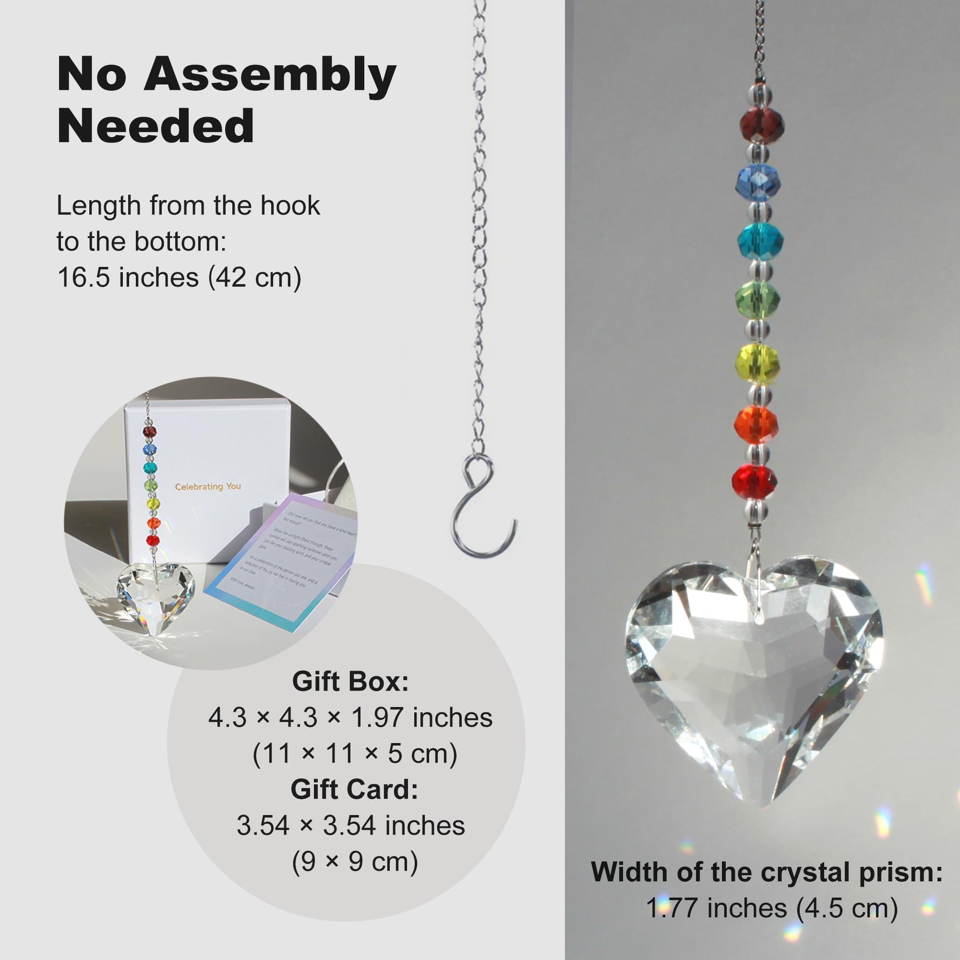 - Clear and Well-cut K9 Crystal Heart, Stainless Steel Chain & Hook, Exquisite Craftsmanship - No assembly needed; hang it as an elegant home decor piece by the window or use it as an enchanting outdoor ornament in the garden or yard. Dimensions: Gift Box - 4.3 x 4.3 x 1.97 inches (11 x 11 x 5 cm); Gift Card - 3.54 x 3.54 inches (9 x 9 cm). The ornament/suncatcher: Length from the hook to the bottom: 16.5 inches (42 cm); Width of the crystal prism: 1.77 inches (4.5 cm)